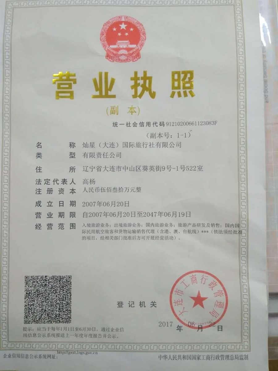 灿星资质(灿星(大连)国际旅行社有限公司)
