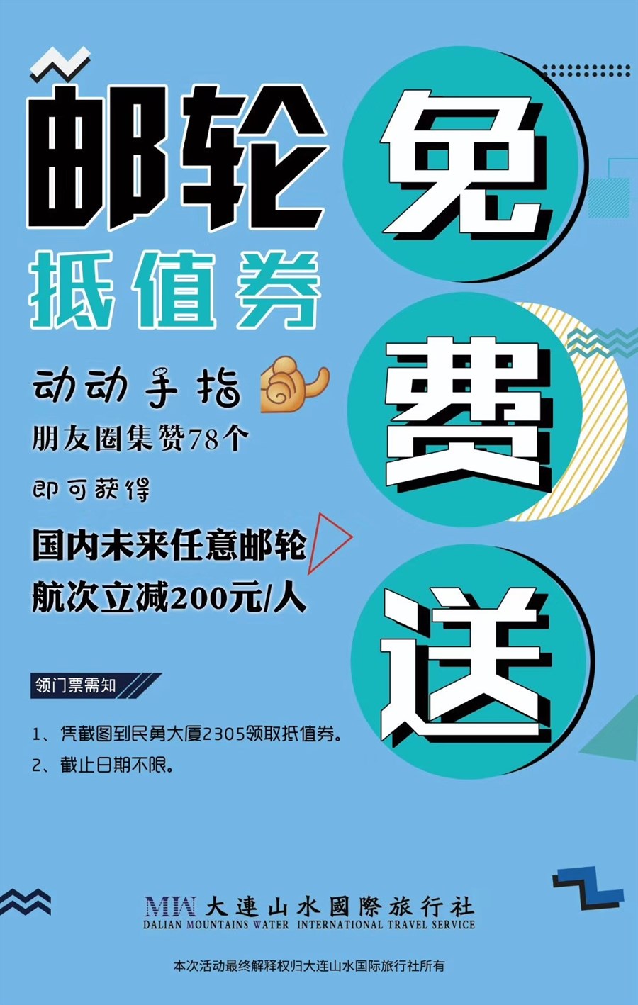 大连山水国际旅行社专业批发零售各邮轮公司全球各线产品,现举行朋友圈集赞满78个,国内未来任意邮轮航次立减200元/人活动,动动你发财的小手,一起来参与吧~