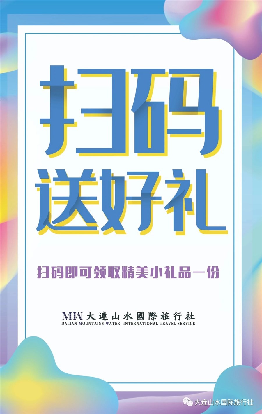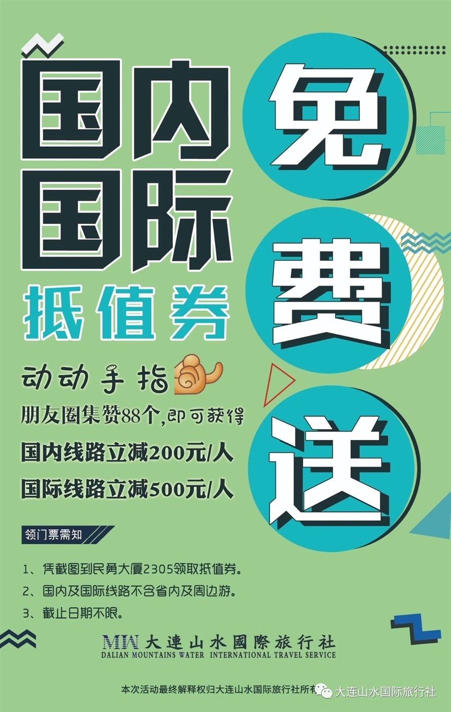 大连山水国际旅行社始建于1992年,二十八年服务质量“零”投诉,AAAA级信誉保证,特许经营出境业务,国家一类社,现举行朋友圈集赞满88个,国内线路(不包括省内及周边游)立减200元/人,国际线路立减500元/人活动,动动你发财的小手,一起来参与吧~