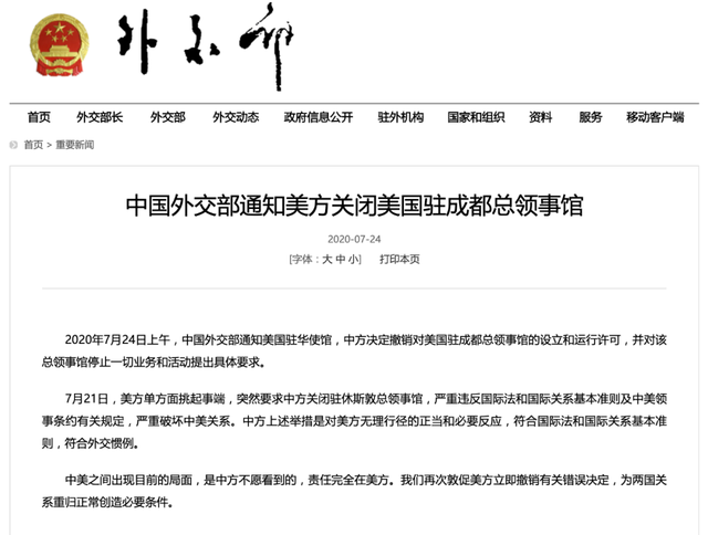 2020年7月24日上午,中国外交部通知美国驻华使馆,中方决定撤销对美国驻成都总领事馆的设立和运行许可,并对该总领事馆停止一切业务和活动提出具体要求。