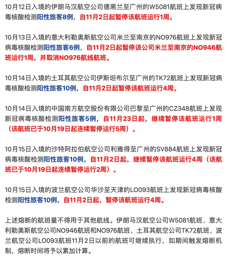 24日晚间,中国民航局最新发布:10月23日,民航局发出熔断指令,分别对伊朗马汉航空公司、意大利勒奥斯航空公司、土耳其航空公司、中国南方航空股份有限公司、沙特阿拉伯航空公司、波兰航空公司相关航班采取熔断措施。